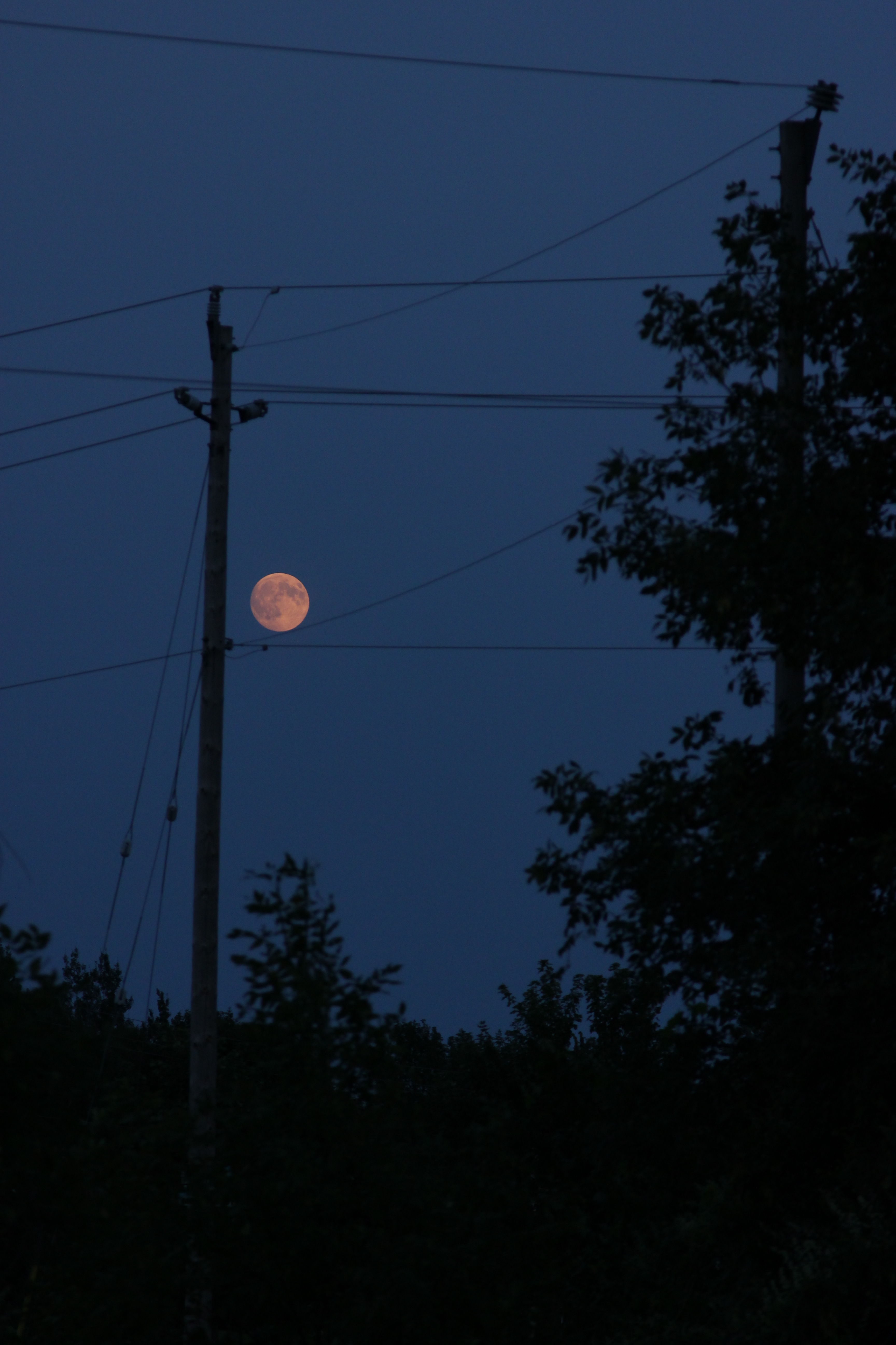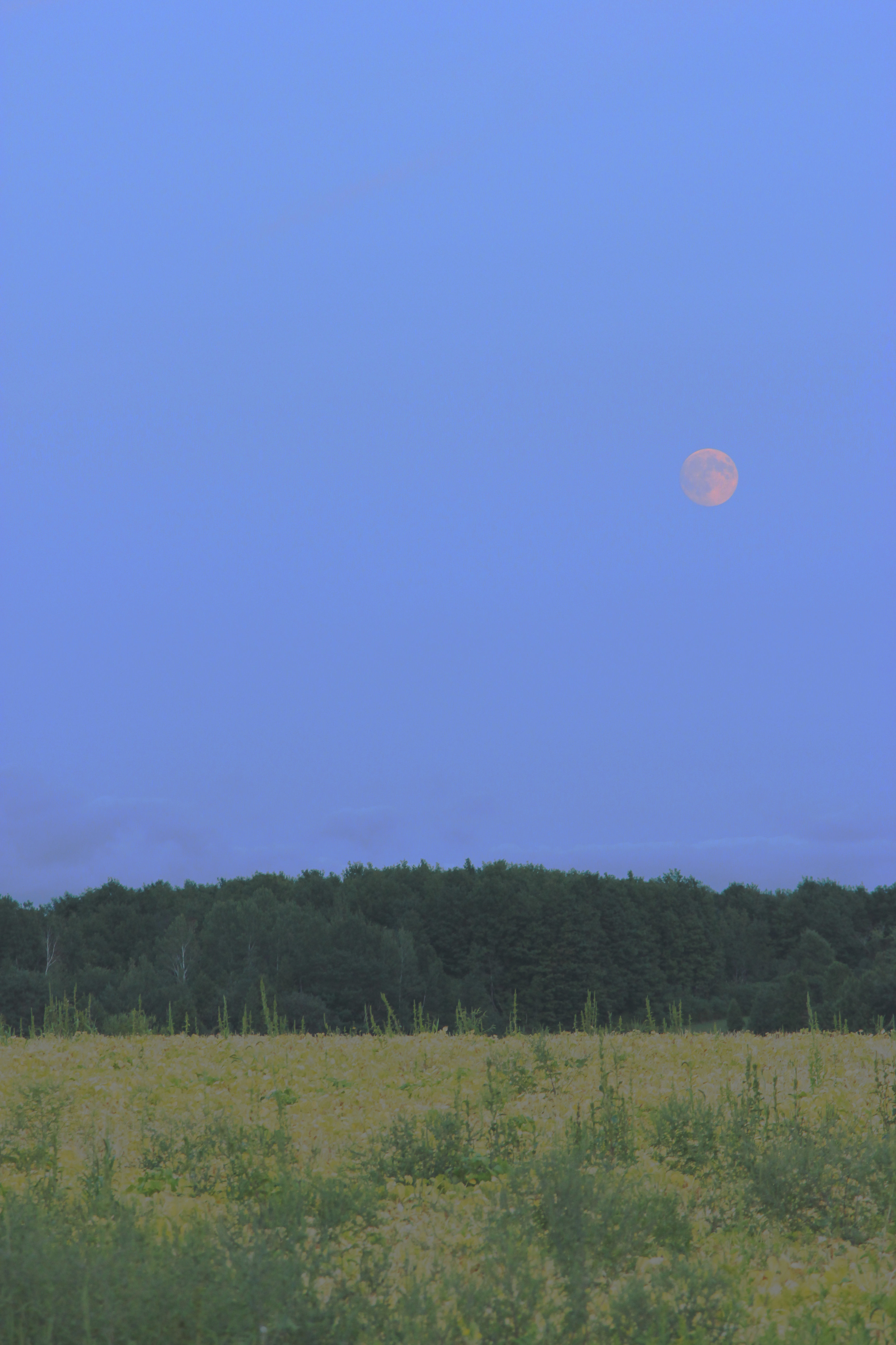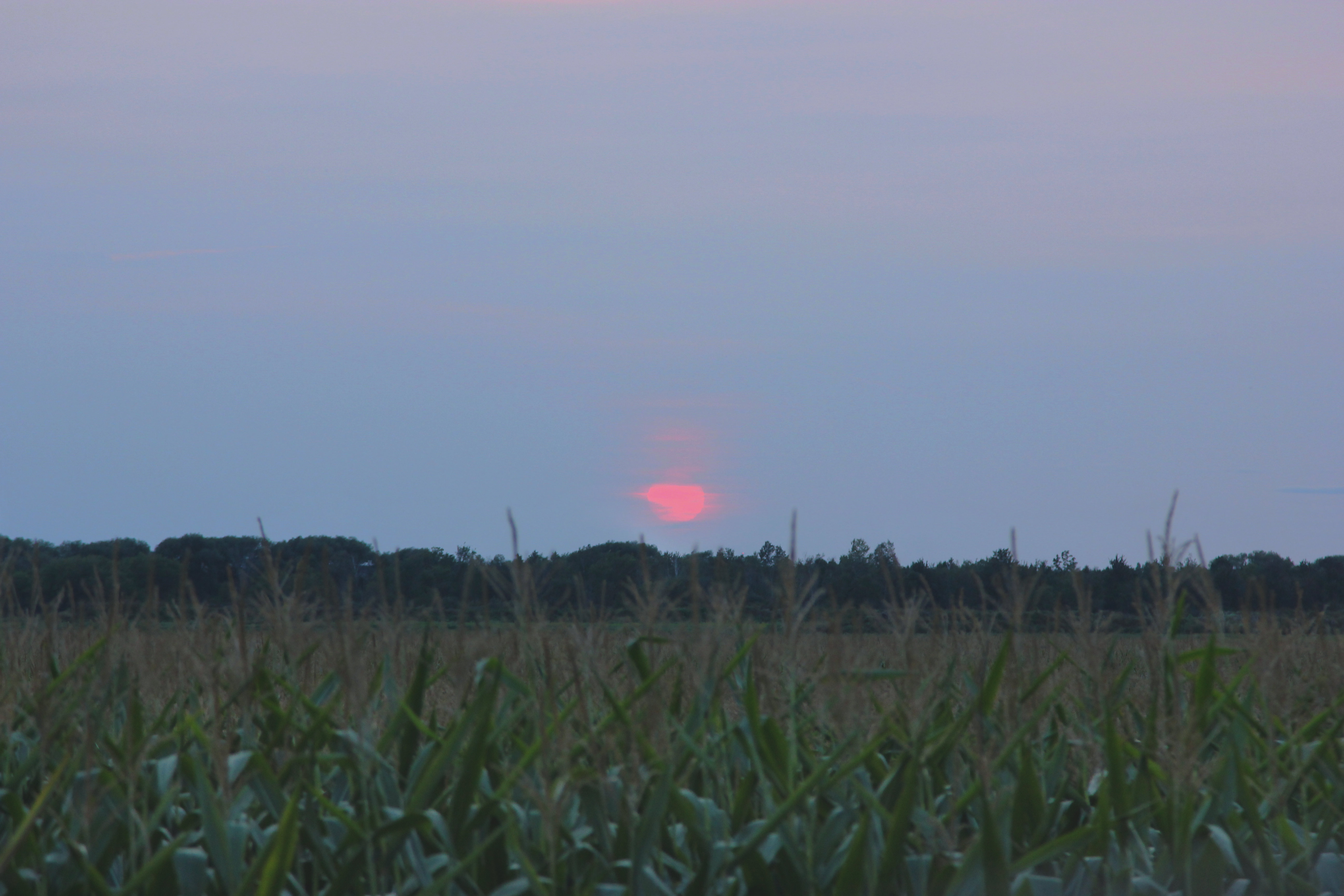 One of the wonderful things about the hot hazy days of August is that they give way to cooler evenings. And with the haze comes a different kind of sunset. I took a short drive up the road near our home to capture just such a sunset. And in finding that it wasn’t much to see over the tall corn stalks, I turned around to see the scene unfolding behind me. I beautiful moon rising over the eastern horizon.